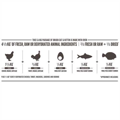 Modern cats and kittens are built like their ancestors. We believe they should eat like them too. That’s why Orijen Cat and Kitten Food is loaded with nourishing protein and fat from free-run chicken and turkey, wild-caught fish and whole eggs, delivered fresh or raw in Wholeprey ratios.