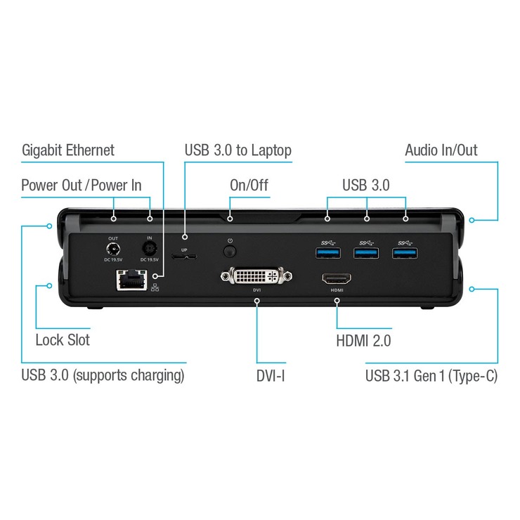 – Charge your devices and connect up to two monitors to your laptop with the Docking Station